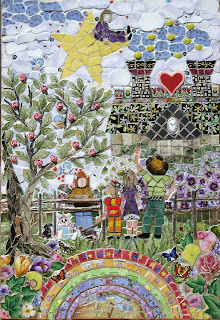 "The central Tree / Goddess figure is in different shades of brown, black and gold. Her arms, hair and branches stretch outwards and upwards, holding all the elements of the four seasons. Spring has dancing butterflies, daffodils and small millefiory flowers, while the branches of the tree are blossoming with beads, more mille and delicate green buds. Summer is full of vibrant green swirls, with added beads and even some jade in there. Autumn (Fall) has seven bright red apples and the leaves of the tree slowly turning to bright oranges, reds and yellows. And finally Winter, with icicles and snow covering the naked branches and the ground beneath her feet. Around the edge of the piece I added symbols for the three phases of the moon and the sun.